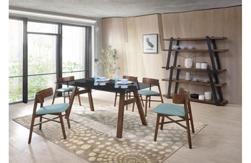 This exquisite Travis and Tobias Modern Walnut Dining Set match up with any dining room theme. It comes with a rectangular table that sits 6 comfortably. With an upholstered seat, the dining chairs have a curved outside back top that seems to hug you and an open back design in the middle section. Walnut wood was used on all items that belie durability. The tempered gray glass table top matches the gray braces of the bookshelf that features 4 Walnut veneer finished open shelves. Give your dining room a new touch with this modern dining set! Set includes the dining table, the bookshelf and  dining chairs.