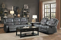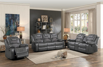 With styling that lends to either transitional or contemporary living spaces, the Trayce Collection will provide a comfortable platform for your much deserved downtime. Gray leather gel match covers this plush seating group. Manually engaged motion mechanisms allow for quick transition from seated to prone with the quick pull of a tab. Each piece in the collection has an individual function allowing for convenience and comfort. The sofa features dual reclining ends, the dual glider reclining ends of the love seat flank a center mounted console with storage and cup-holders, and the chair features a glider mechanism that allows for easy back and forth motion.