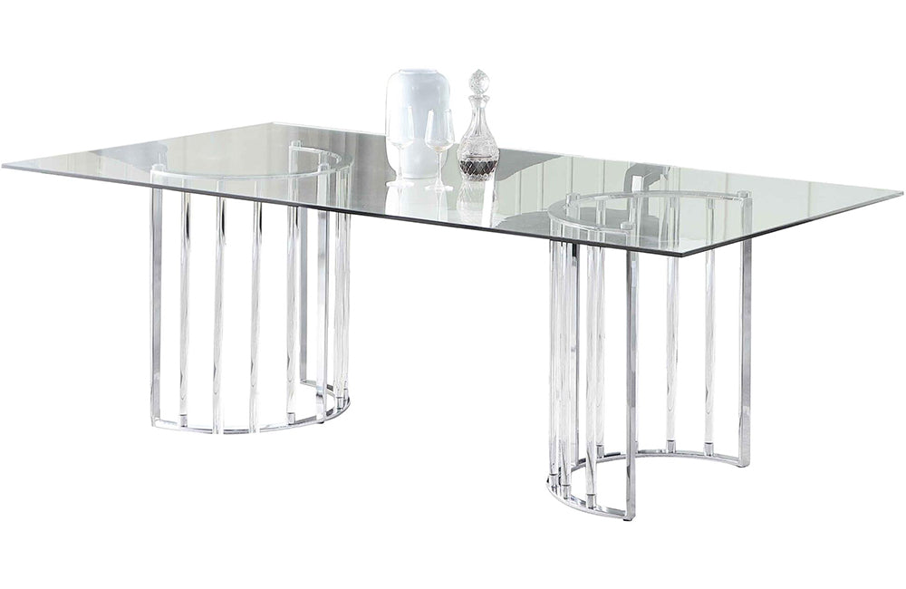 36"x 60" w/ 1" Radius Corners - 3/8"-Thick Glass - 1"Bevel, TRISHA Dining Table Base Steel & Solid Acrylic Double Pedestal Semi-circle Base Finish: Chrome / Clear Standard Pack - Semi KD.