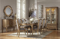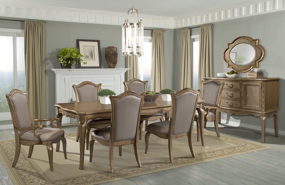Modern elegance takes form in the Valencia Collection. Immediately catching your eye is the striking champagne gold finish, an opulent mix of silver and gold hues, elegantly accented by the faux silk fabric and gold brushed hardware that is featured on select pieces of the collection. The serpentine-fronted table, china, and server are adorned with canted pilasters featuring overlay fretwork, scalloped bases and delicately splayed cabriole legs. Further lending to the lavish look of the collection is the faux silk back and seat of the coordinating chair. The server features drawer and door storage as well as an elegant quatrefoil hanging mirror. Completing the look of the collection is the graceful china. With mirrored backing, light feature, glass display shelving, and drawer storage, your dining room will be the talk of the dinner party.