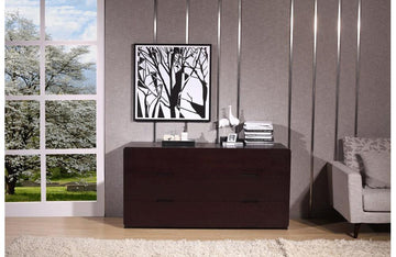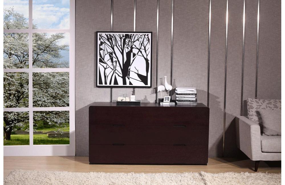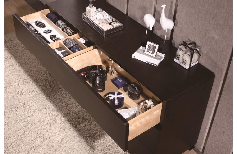 Vasileios 6 Drawer Dresser shows off a distinctive shape with a warm Oak veneer in wenge finish. Vasileios 6 Drawer Dresser has an auto return system on the drawers.