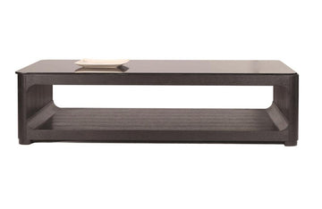 Modern black oak veneer rectangular coffee table with black glass top and with open storage compartment.
