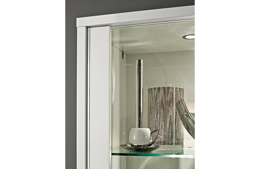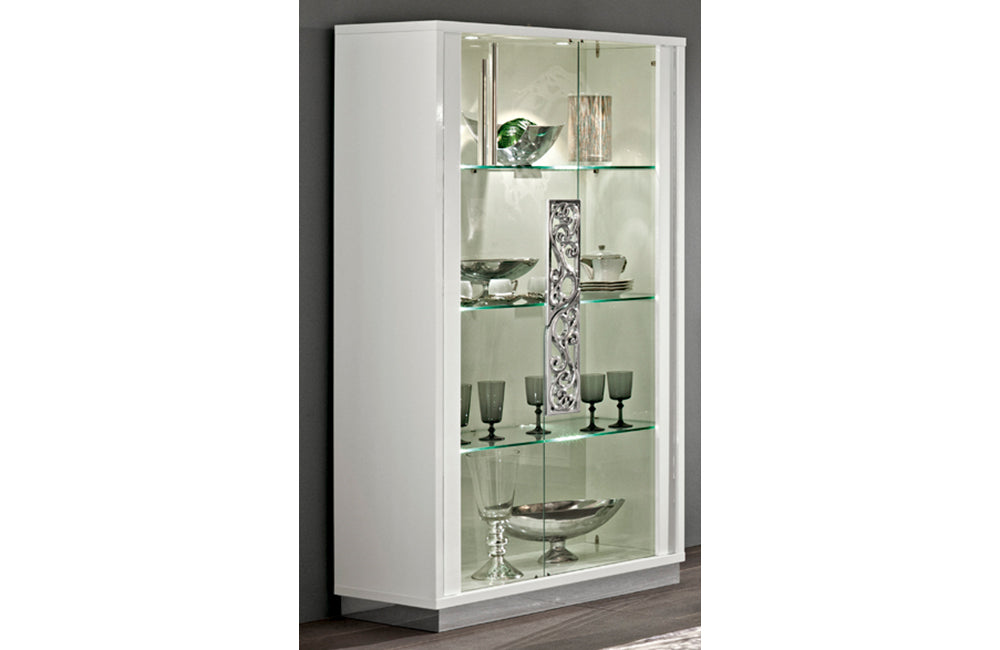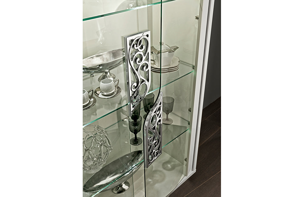 Contemporary interiors with a touch of ‘glamour’. The handle answers this very exigency without affecting the linear balance of the composition.Glass doors are wave shaped to follow the lines of the chromed “décor-handle”.The small handles matching the central “décor-handles” are in chromed metal.
