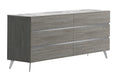 The Victoria Bedroom collection is the newest and most exciting addition to the Paramus bedroom lineup. The Victoria Bedroom is made in Italy with the finest materials. The bed and case goods feature a light grey oak veneer, accented by brushed nickel accents. The sides of the headboard feature a light grey marble look, which flows down upon the tops of the accompanying nightstands. The matching dresser and chest tops also feature this same light grey marble look. This seamless combination of finishes creates a perfect collection of furniture meant to turn any home into a luxury venue.