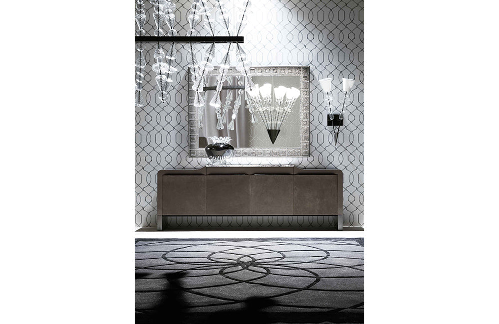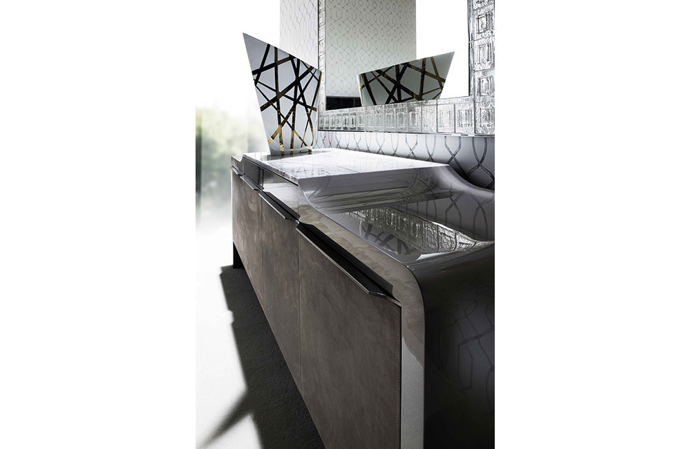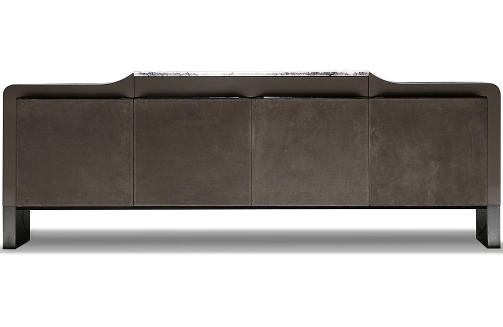 4 doors upolstered in natural protected nubuk leather, top in marble and structure in high gloss polyester grey lacquer.