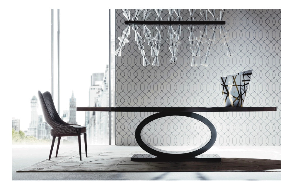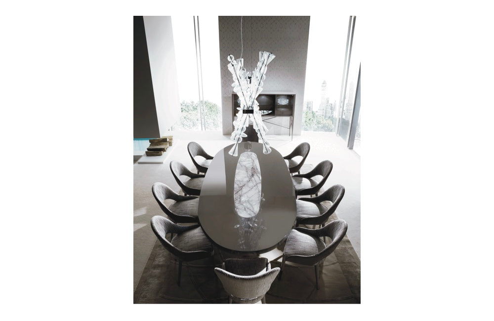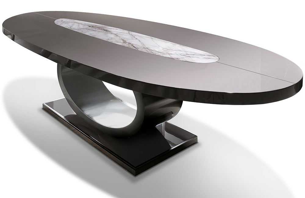 Oval fixed table in high gloss polyester grey lacquer with marble top insert.