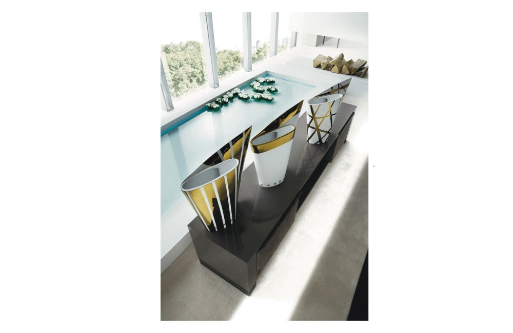 2 doors with fronts in natural protected nubuk leather, 1 center open space w/glass.