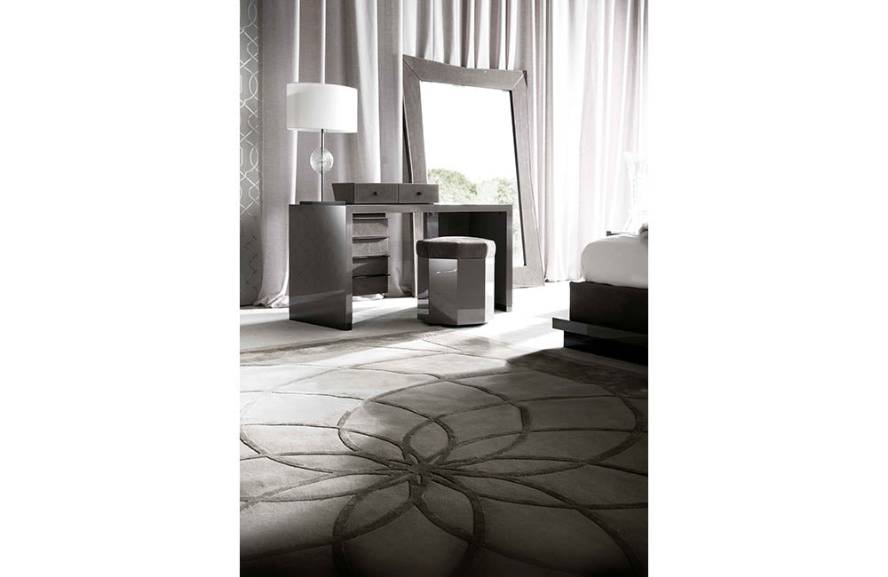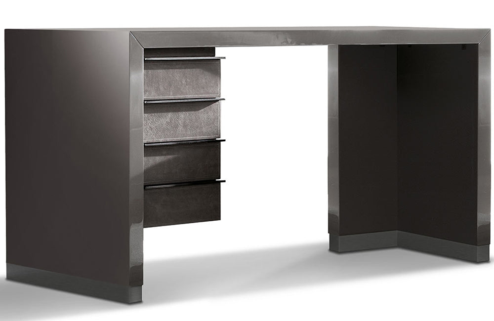Vanity desk in high gloss polyester grey lacquer w/4 full extension drawers drawers with fronts in natural