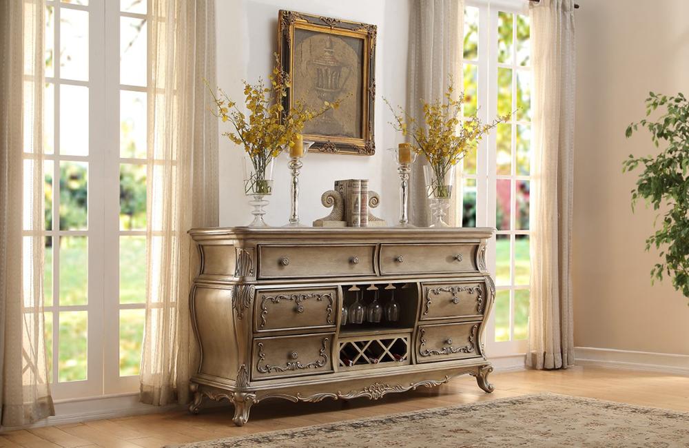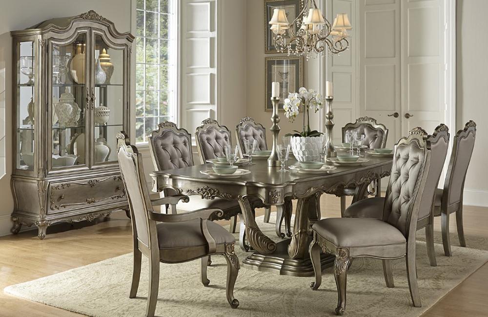 The elaborate designs of Old World Europe are treated with a distinct modern touch in the Vittorio Collection. The elegant pedestal base table serves as the focal point of this stunning dining offering. With details such as shell and acanthus leaf scrolling which grace the table’s apron to the eye-catching jewel tufting of the accompanying chairs, which reflect with a brilliance intended to accentuate the dusky taupe coloring of the faux silk and the rich silver – with gold undertone – finish of the wood veneer. The acanthus motif is carried over to the display china, along with carved cabriole feet, delicately designed knob hardware, glass shelving, and drawer storage, complete the traditional look of the collection.