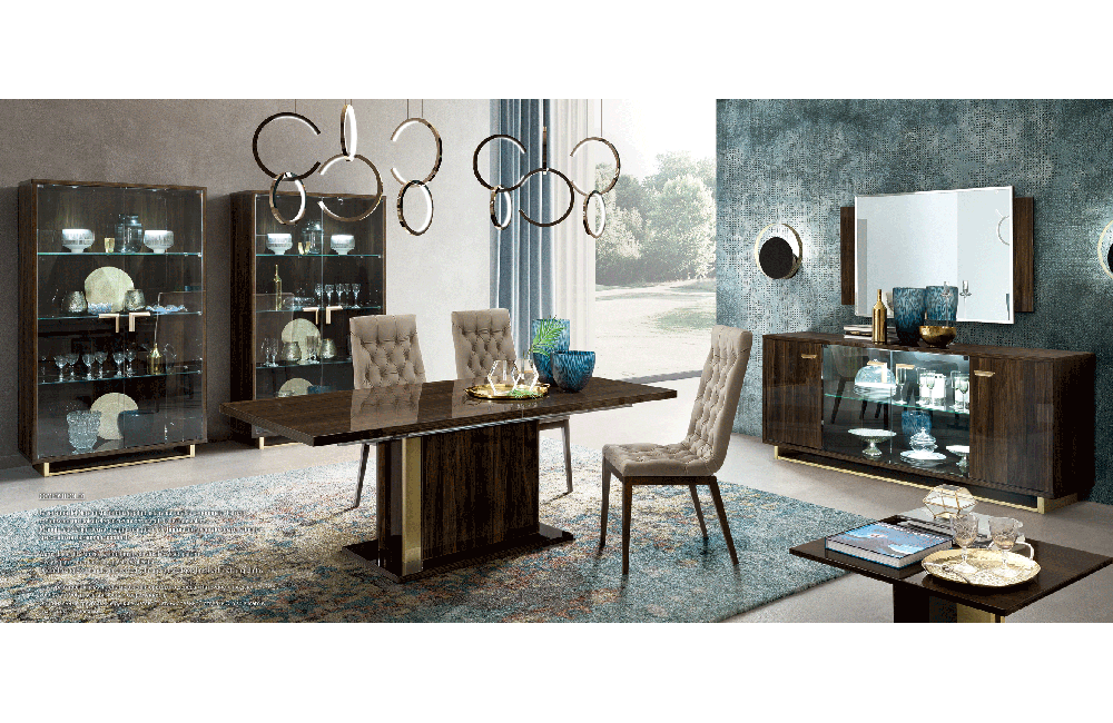 Exceptional New Volare Dining in high gloss walnut & gold color.