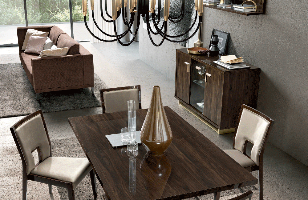 Exceptional New Volare Dining in high gloss walnut & gold color.