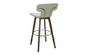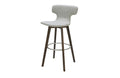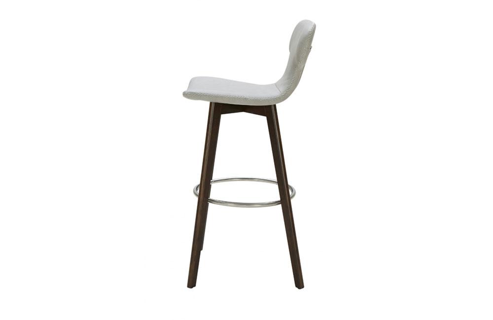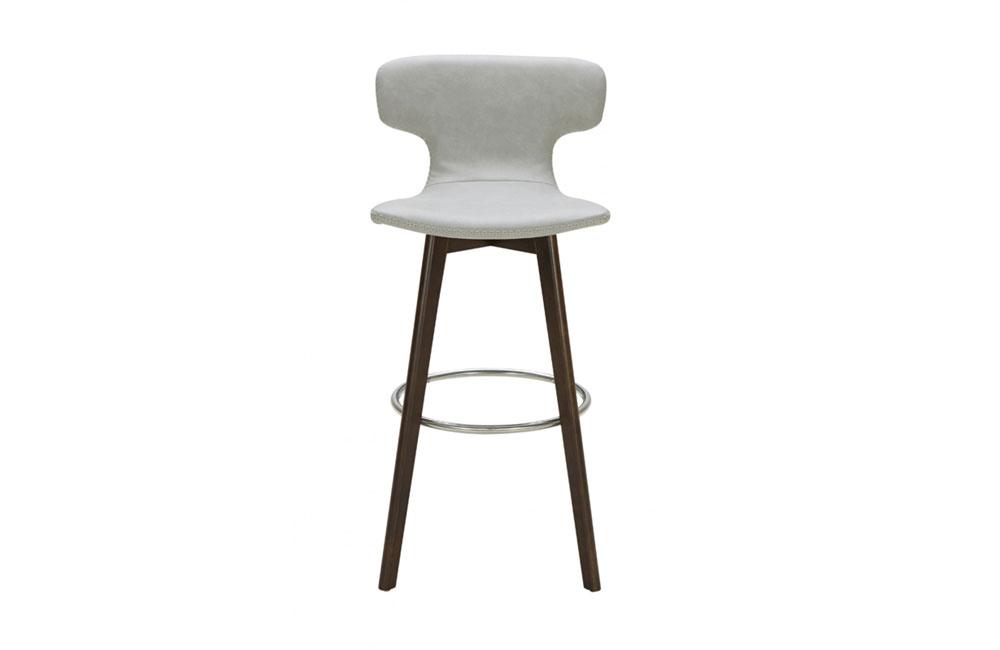 The Zach Modern Light Gray Eco-Leather Bar Stool exhibits an inventive design featuring a striking bodice structure in charcoal eco-leather upholstery. Preventing your feet from dangling when seated is a round chrome footrest. Available also in Dark gray Leather.