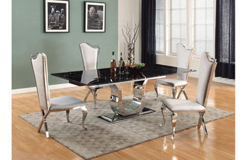 This unique Horseshoe shaped pedestal and Marble table top makes serving dinner a special moment to friends & family. With an extendable table top, it seats six to eight comfortably. Complete the look with the tall-back side chairs featuring a stylish "X"-back chair leg.