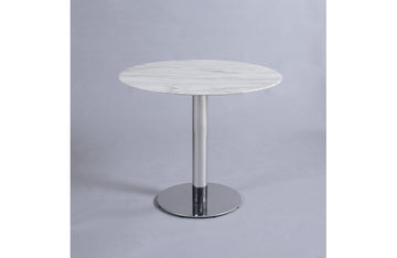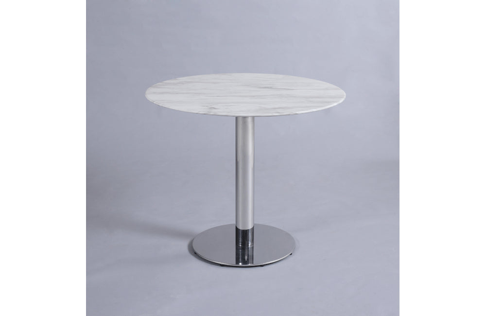 The Zeta Collection Dining Table is sure to make a splash. The table features a bistro styled cararra marble top supported by a stainless steel pedestal base.